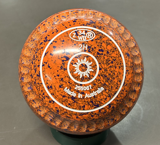 Aero Dynamic New Lawn Bowls, Size 2, New Enhance Grip, Orange with purple speckles, stamped 2034 with sun logo.