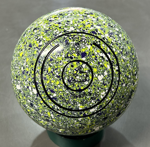 Aero Dynamic New Lawn Bowls, Size 3.5, Gripped, Green with light green, black and white speckles, stamped 2035 with thumbs up logo.